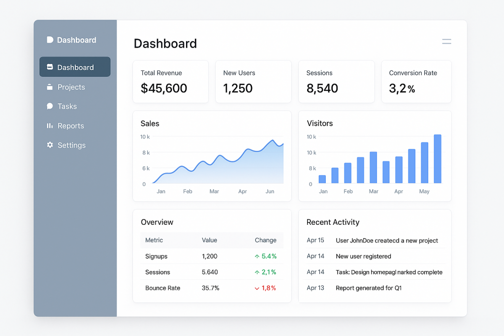 “Design a modern, clean analytics dashboard with a left-hand nav and a stats summary area with charts.”