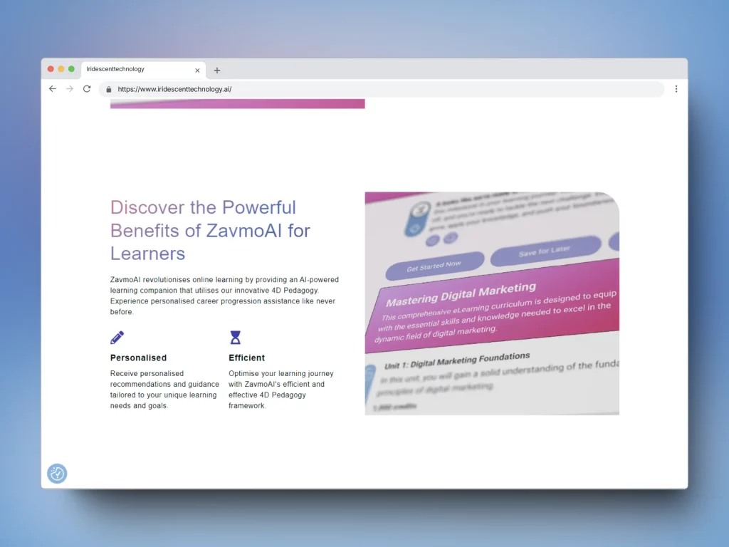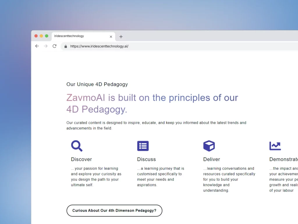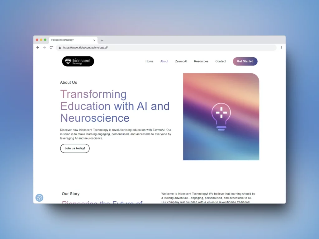 Iridescent Technology is a newly founded company that uses AI and neuroscience to develop ZavmoAI. This AI-powered learning companion is designed to ignite curiosity and guide individuals on their learning journeys. The website needed to establish a professional presence and attract visitors. Its main goals were to inform people about the company and entice them to sign up for the newsletter or register for the ZavmoAI BETA.